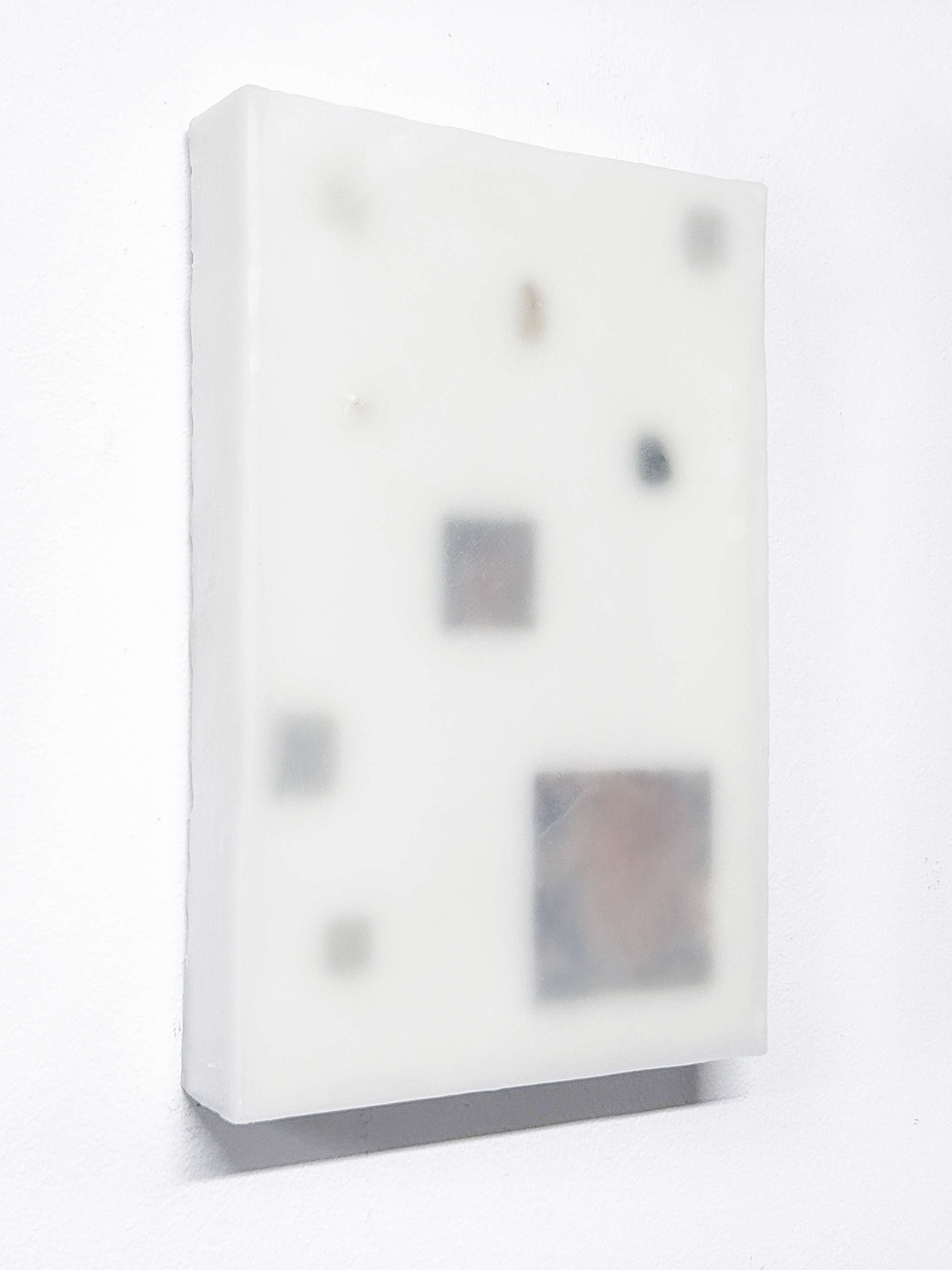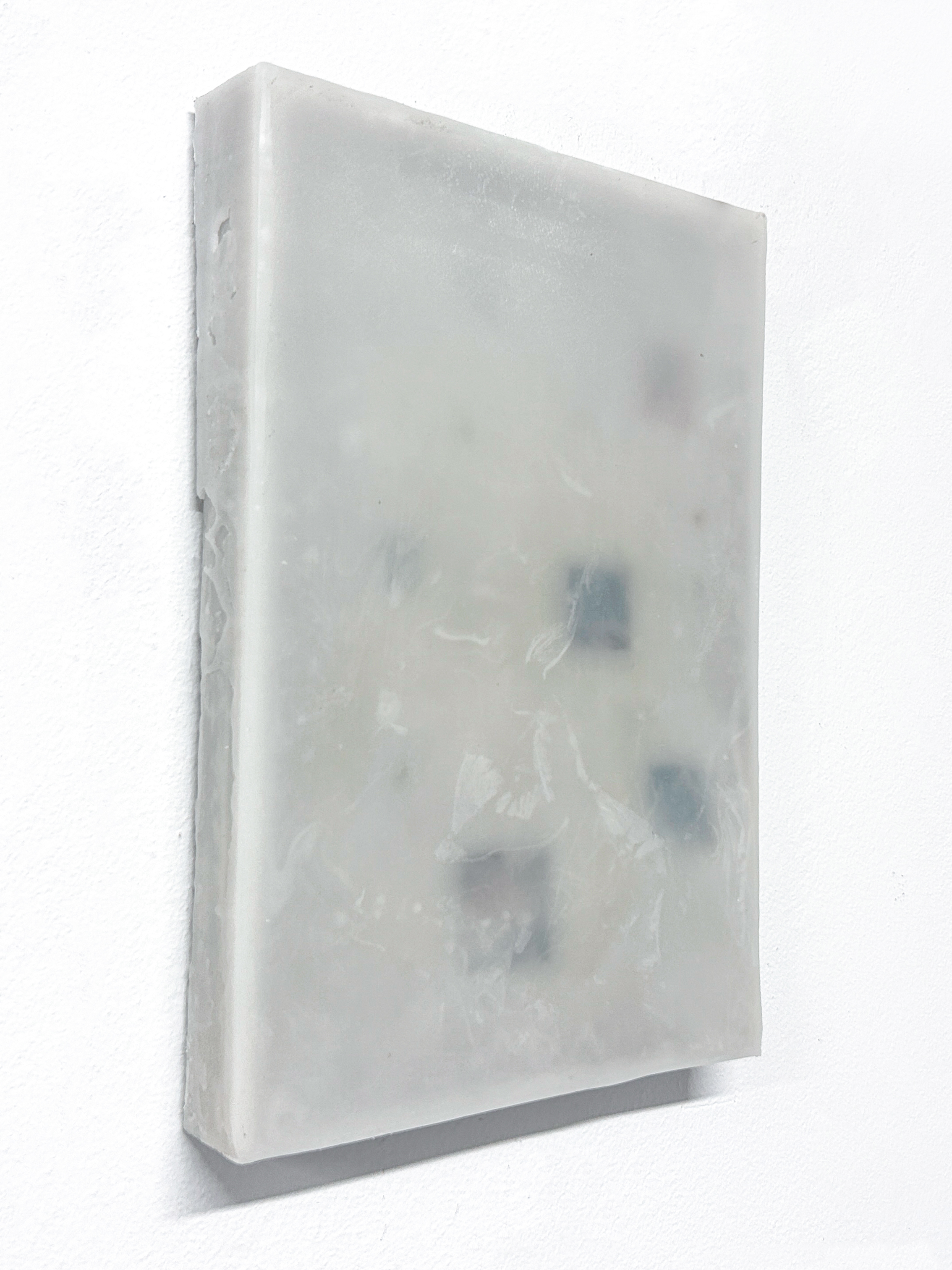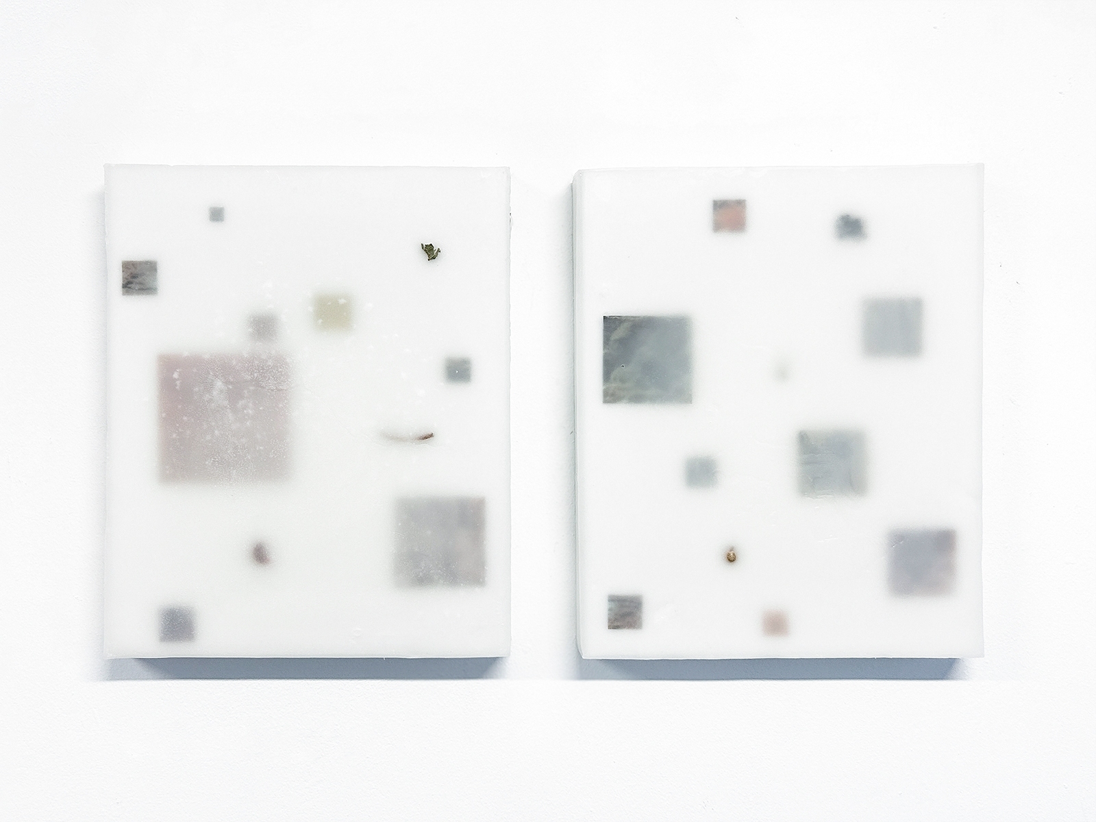 During his stay in Lanzarote, Minch builds a bank of surfaces: photographs of textures, traces, and imprints of the environment, alongside small organic and mineral elements collected on the island. These remnants are encapsulated in wax frames, creating pieces that oscillate between preservation and transformation. Wax acts as a membrane that veils and unveils, protecting while also yielding to the passage of time and climatic conditions.